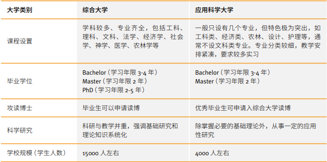 • 应用科学大学(Fachhochschule (FH), Universityof Applied Sciences):此类大学大部分建校时间较短,规模不大,一般只设有几个专业,但其特色极为突出。分别设有工程、技术、农林、经济、金融、工商管理、设计、护理等专业,原则上不设一般意义上的文科类专业。其课程设置和内容除必要的基础理论外,多偏重于应用,专业分类较细,教学安排紧凑,要求较多实习。